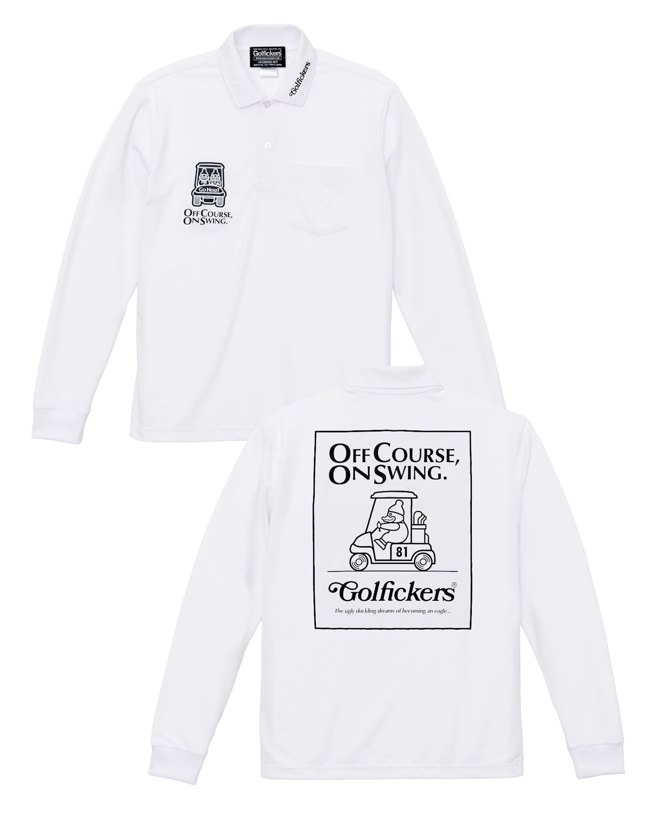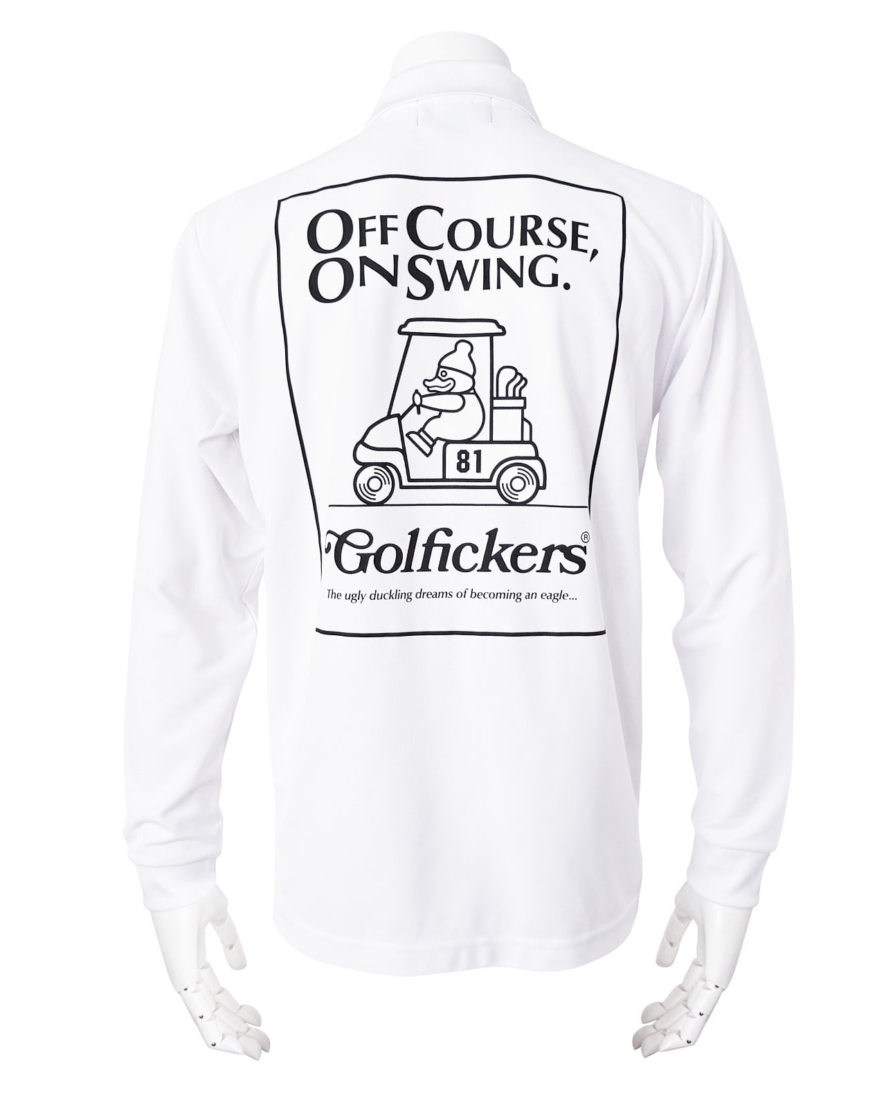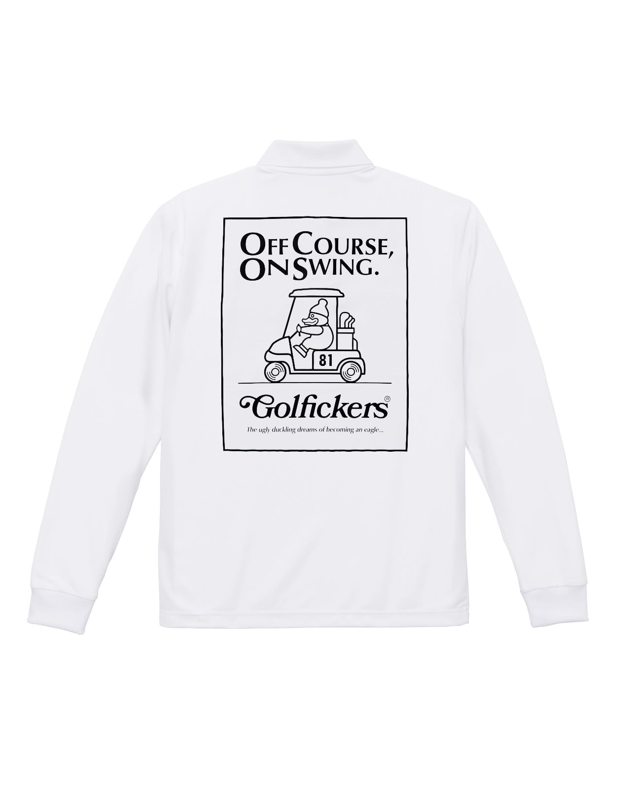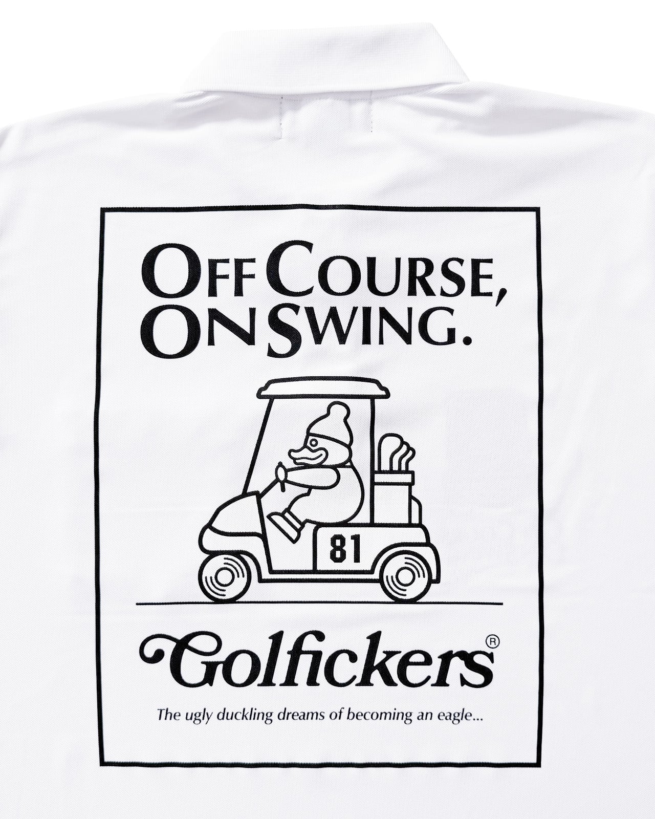 背面には「OFF COURSE, ON SWING.=いつだってゴルフに夢中なのさ」のメッセージとGolfickersらしい大胆なグラフィックをプリント。スタイリッシュさと遊び心を融合させ、フィールドから街まで活躍する一枚に仕上がりました。