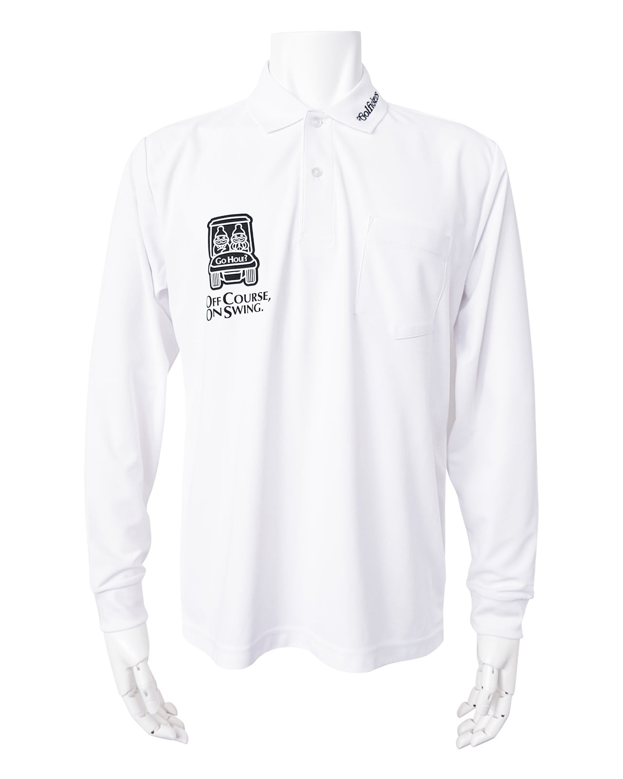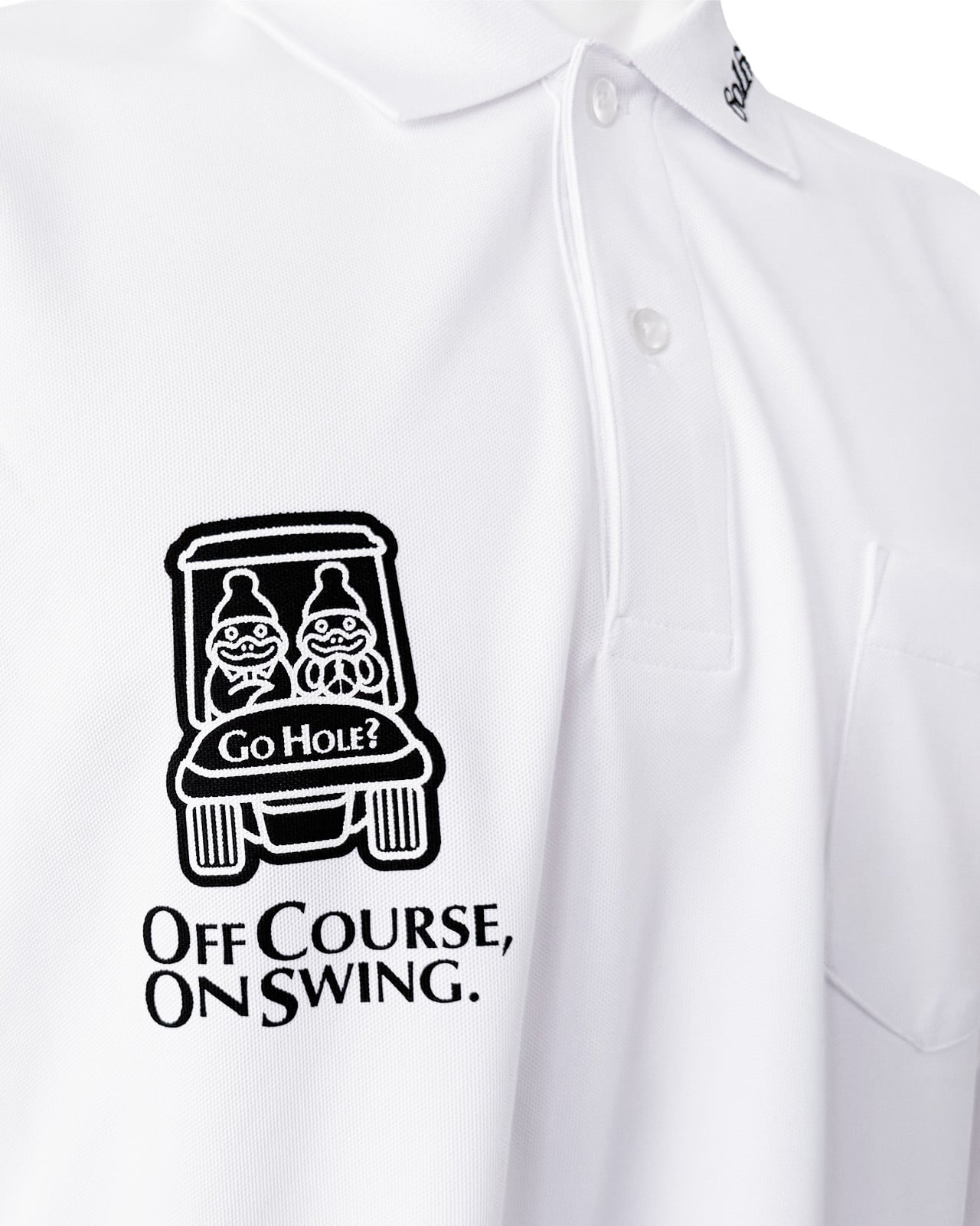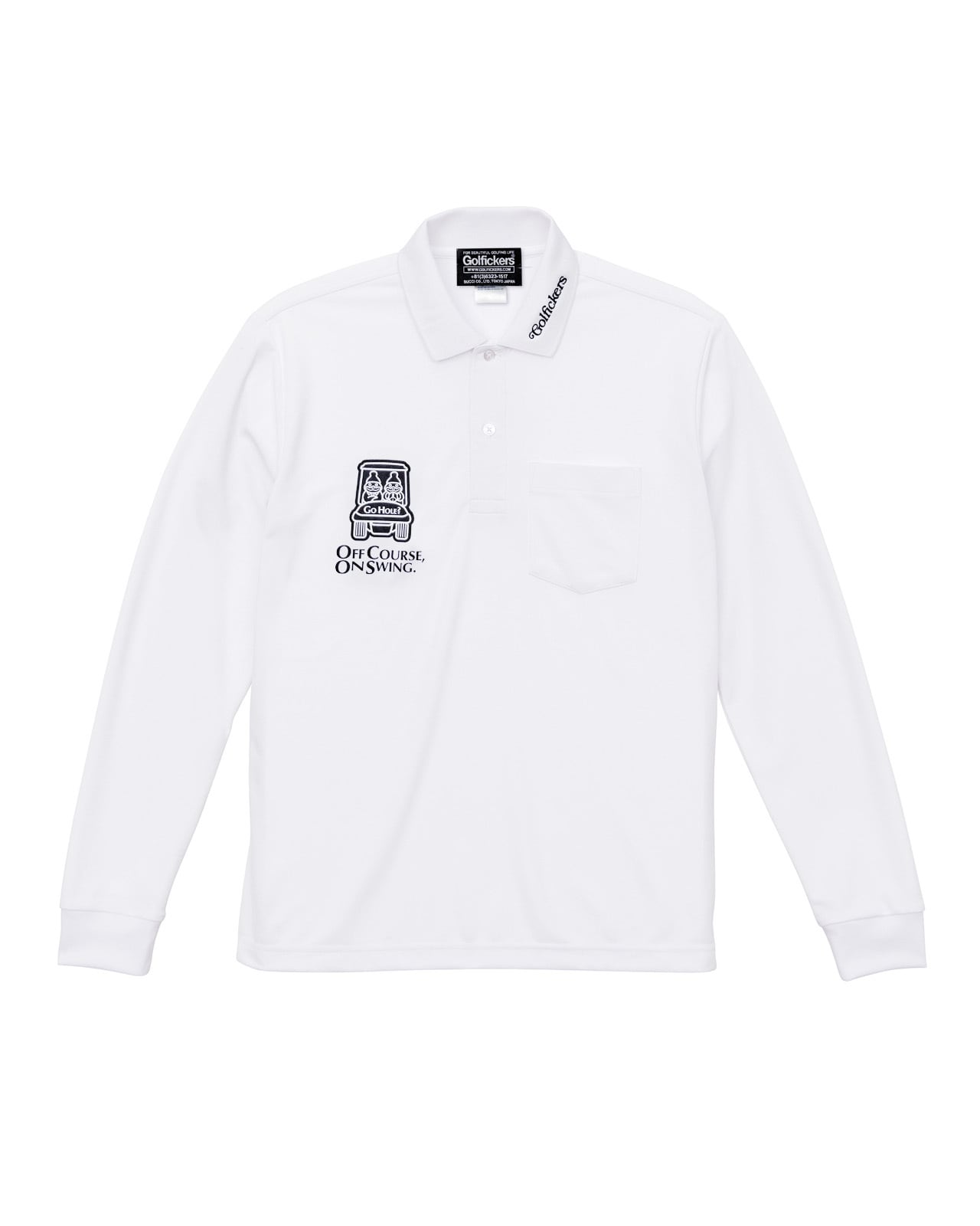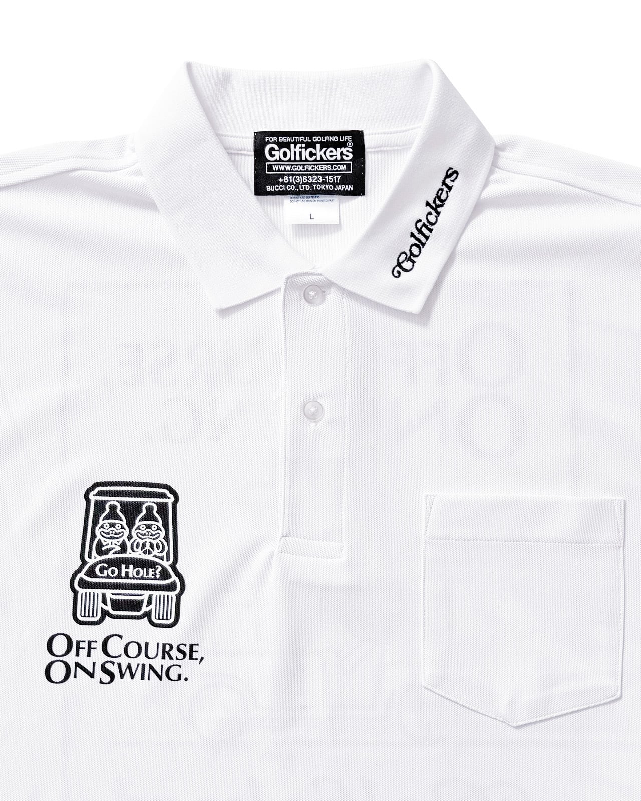 背面には「OFF COURSE, ON SWING.=いつだってゴルフに夢中なのさ」のメッセージとGolfickersらしい大胆なグラフィックをプリント。スタイリッシュさと遊び心を融合させ、フィールドから街まで活躍する一枚に仕上がりました。