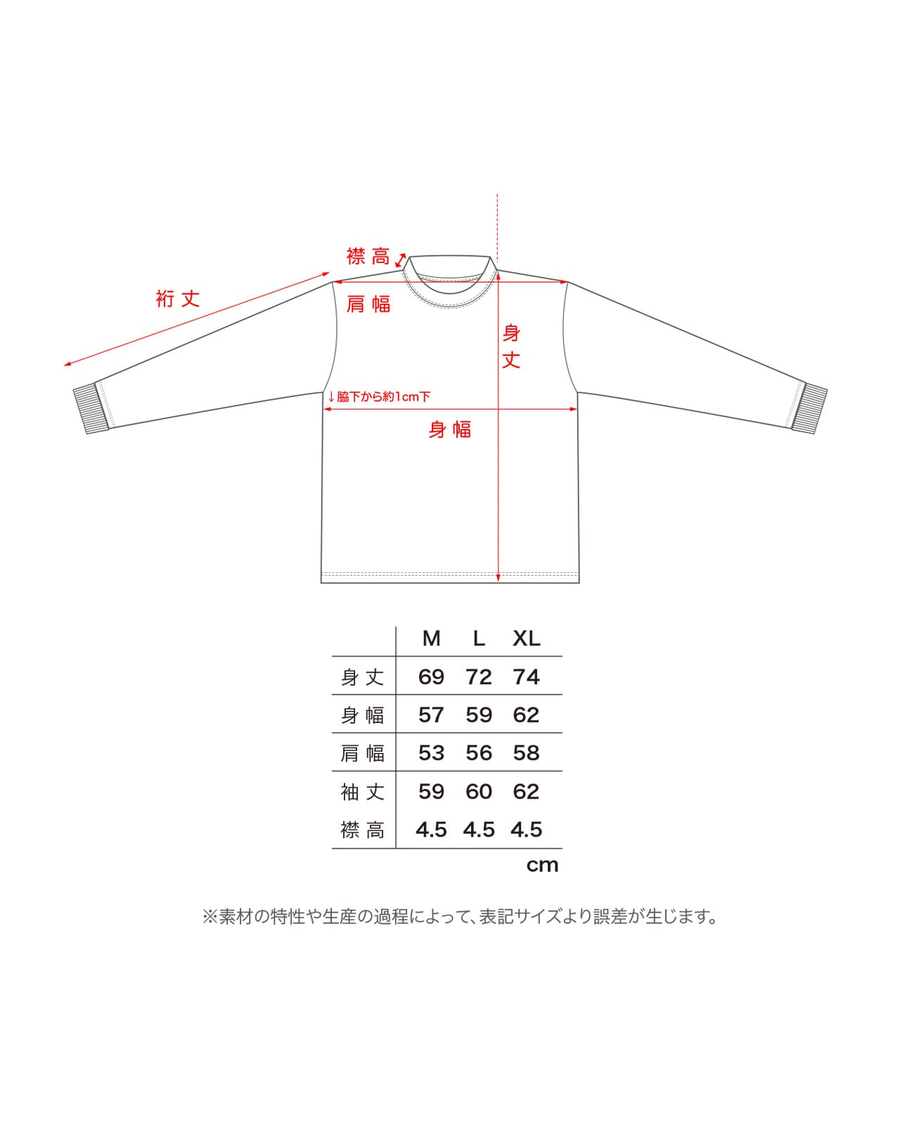 [ L ].....身丈72・身幅59・肩幅56・袖丈60・襟高4.5